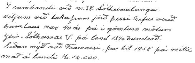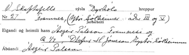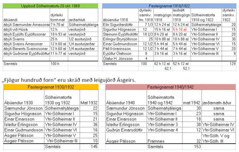 Ljóst er að hér er ekki bókað af nákvæmni. Ásgeir var aðeins eigandi að Ytri-Sólheimum III sem eru 9 H í fasteignabókinni frá 1922 og Ólafur var eigandi að Ytri-Sólheimum V sem eru 20 H í þeirri sömu bók. Það sem skráð er „Ca. 1/7“ er nytjahluti Ólafs úr samsteypunni Framnes og liggur þá beint við að þar séu fjögur hundruðin fornu sem hann nytjaði sjálfur. Vegna nafnabreytinganna losna jarðanúmer og stjórnvaldinu verða á þau afglöp að breyta og víxla númerum jarða. Jörðin Ytri-Sólheimar IV fær nafnið Ytri-Sólheimar III og fleira álíka gáfulegt er gert næstu áratugina.[22]
