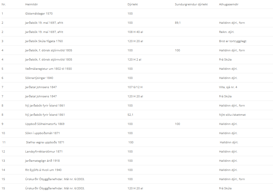 Athygli vekur að jörðin Ytri-Sólheimar 3a er skráð með sama land- og hlunnindaverði eins og í úrskurðinum frá 18. des. 1970. Samræmið í töflunum er sláandi. Enginn vafi er á að eigendur Ytri-Sólheima 3 hafa verið rændir hluta af eigum sínum.